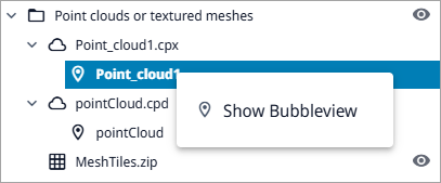 To verify that the point clouds can be displayed, open eShare App, open the Model view of the project, and then in the Model tab either double-click a point cloud name or right-click it and select Show Bubbleview.