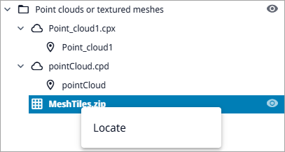 To verify that the textured meshes can be displayed, open eShare, open the Model view of the project, and then in the Scans tab right-click the name of the textured mesh, and select Locate.