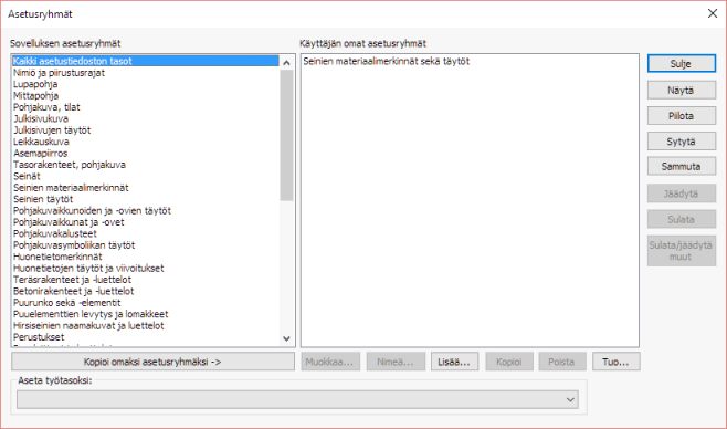 Ikkuna jakautuu kahteen listaan, jossa ensimmäisessä esitetään CADMATIC Building -sovelluksen omat asetusryhmät sekä toisessa käyttäjän omat asetusryhmät. Sovelluksen omia asetusryhmät ovat kiinteitä asetusryhmiä eli niiden sisältöä ei voi muokata. Sovelluksen asetusryhmät päivitetään aina ohjelman päivityksen yhteydessä. Voit halutessasi kopioida kiinteän asetusryhmän omaksi (painike: Kopioi omaksi asetusryhmäksi), jolloin sitä voi muokata halutunlaiseksi. Kopioitu asetusryhmä saa saman nimen kuin alkuperäisellä asetusryhmällä oli. Asetusryhmää voi käsitellä Käyttäjän omat asetusryhmät -listan alapuolisilla painikkeilla.
