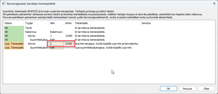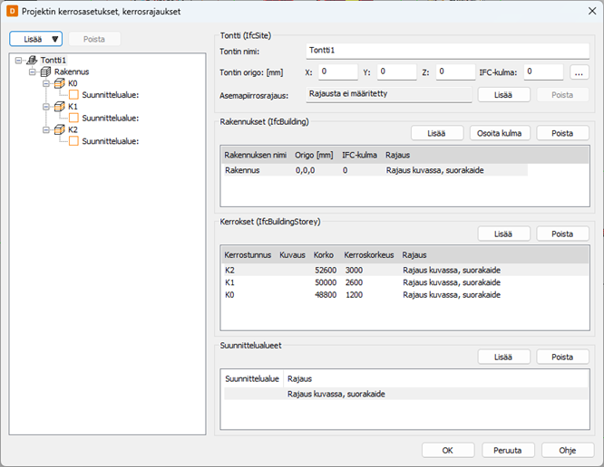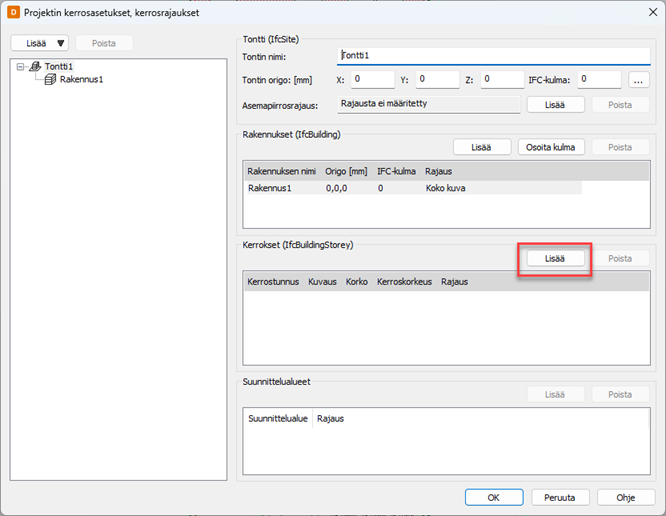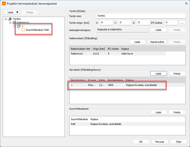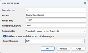 Helpoin tapa lisätä kerrosrajaukset kohteelle on lisätä vain kerrostiedot siten, että suunnittelualue lisätään samalla.