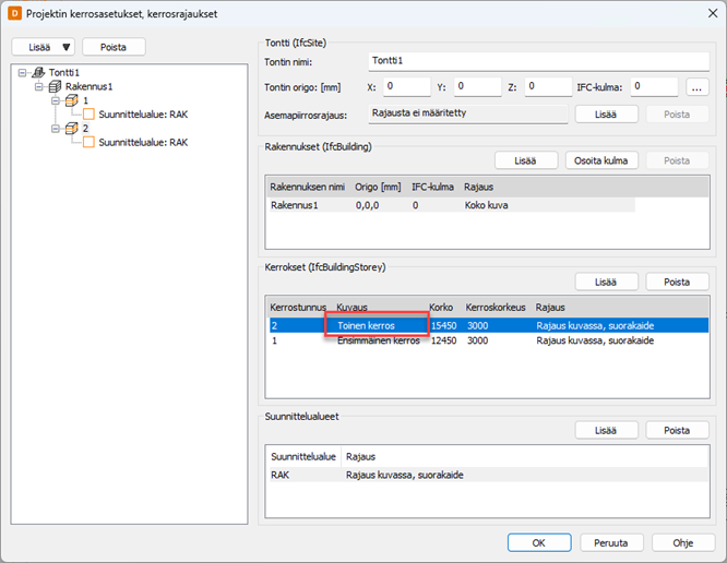 Kerrostunnus on lyhyt kirjain- tai numerotunnus ja pidempi selostus kerroksesta kirjataan Kuvaus -kohtaan. Korko on kerroksen määräävän pinnan korko (esim. valmis lattiapinta). Korko on suhteellinen tontin ja rakennuksen origoon. Kerroksen korkeuteen lasketaan mukaan välipohja ja se kerrotaan millimetrein. Suunnittelualueet-kentässä näkyvät kullekin kerrokselle lisätyt suunnittelualueet.