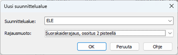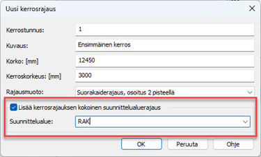 Valitse lisätäänkö kerrosrajauksen kokoinen suunnittelualuerajaus ja lisää tarvittaessa suunnittelualueen tunnus.