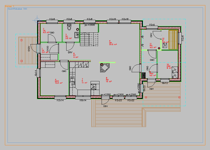 Osoita rajaus siten, että koko kerros jää rajauksen sisälle. Huomioi varsinkin ovien avautumiskaaret ja räystäät. HUOM! Rajauksen ei ole pakko olla samankokoinen jokaisessa kerroksessa.