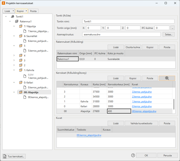 Kerrostunnus voi olla lyhyt kirjain- tai numerotunnus ja pidempi selostus kerroksesta kirjataan Kuvaus -kohtaan. Korko on kerroksen määräävän pinnan korko (esim. valmis lattiapinta). Korko on suhteellinen tontin ja rakennuksen origoon. Kerroksen korkeuteen lasketaan mukaan välipohja ja se kerrotaan millimetrein. Kuvat -kentässä näkyvät kullekin kerrokselle lisätyt tiedostot. Kentästä voi avata halutun tiedoston.