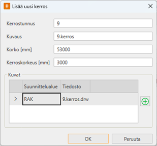 Lisää: Lisää uuden tiedoston aktiivisena olevaan kerrokseen. Tiedostolle voidaan halutessaan lisätä myös suunnittelualueen lyhenne (esim. RAK, ELE...).