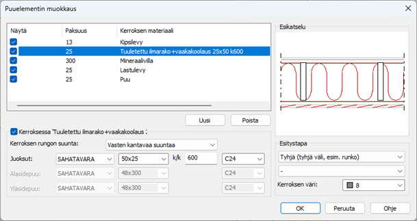 Muokkaustoiminnossa voidaan vaihtaa rakennekerroksien tietoja, mm. sitä, mitkä kerrokset elementissä näytetään.