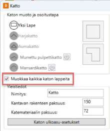 Muut asetukset muokataan samassa dialogissa, kuin missä katon asetukset säädettiin. Jotkin asetukset eivät ole muokattavissa, riippuen hieman katon mallista. Jos halutaan muokata useamman lappeen kattavista katoista vain yhtä lapetta, voidaan ottaa pois valinta Muokkaa kaikkia katon lappeita.