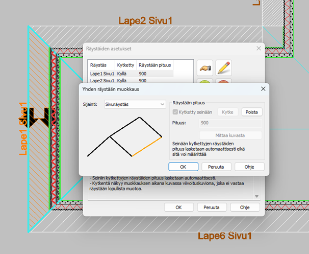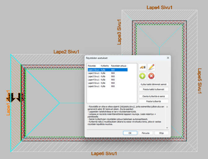 Tässä ikkunassa voidaan myös tehdä seinien kytkentöjä kaikkiin tai yksittäisiin räystäisiin niille tarkoitetuilla painikkeilla. Muokkaus suoritetaan dialogissa.