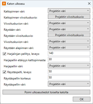 Muokkaa lappeita dialogissa. Voit muokata kattojen ja räystäiden väriä ja viivoituskuviota, sekä valita piirretäänkö harjalinjaan pellitys.