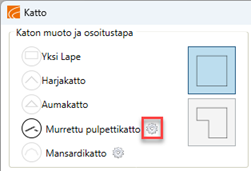 Building-sovellus > Arkkitehti-välilehti > Katto-ryhmä > Määritä -toiminto > Murrettu pulpettikatto-muoto