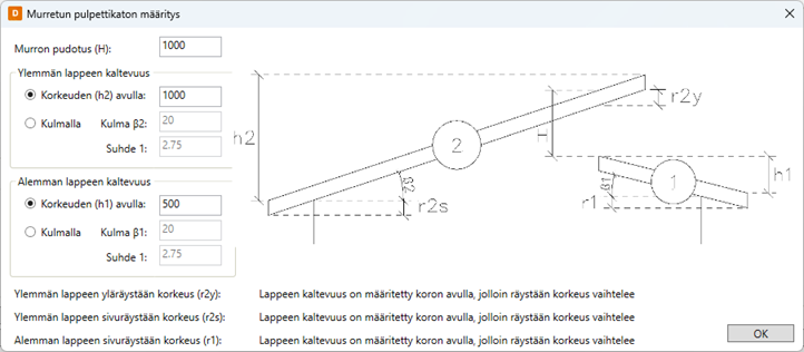 Syötä ylemmän ja alemman lappeen kaltevuudet joko korkeuden tai kulman avulla.