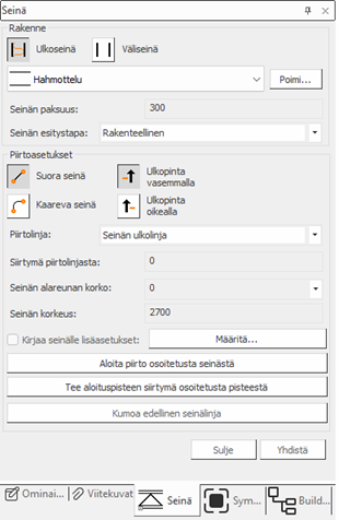 Valitse ulkoseinä tai väliseinä. Vaikka samat toiminnot yleisesti toimivatkin molemmille seinätyypeille, piirtyvät seinät eri tasoille. Valinta vaikuttaa myös mm. julkisivutoimintoon.