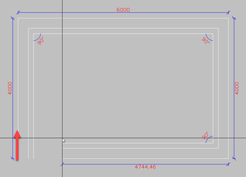 Tee aloituspisteen siirtymä osoitetusta seinästä -painikkeella voidaan piirto aloittaa osoitetusta, aikaisemmin piirretystä seinärakenteesta. Osoita seinä, josta haluat siirtymän määrätä. Valinta lukkiutuu seinän suuntaisesti ja origo piirtyy siihen päähän, jota lähempää osoitus tehtiin. Osoita hiirellä siirtymän suunta ja syötä siirtymä. Jatka seinän piirtämistä normaalisti.