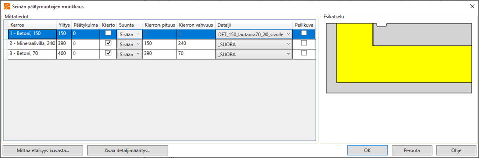 Seinän valintakohta vaikuttaa siihen, kumpaa päätyä muokataan. Valitse seinä siis sieltä päästä, kumpaa päätyä haluat muokata. Seinän päätymuoto määritellään dialogissa.