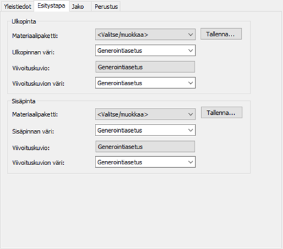 Tässä välilehdessä määritetään seinän 3D-malliin ja julkisivuun generoituvat esitystavat. Näitä noudatetaan, mikäli generoinnissa esitystapa luetaan seiniltä.