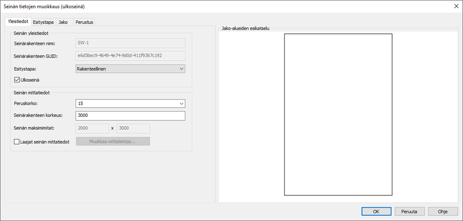 Välilehdellä esitetään seinärakenteen nimen ja yksilöllisen tunnisteen lisäksi seinän esitystapa sekä maksimimitat. Välilehdeltä on myös mahdollisuus muuttaa seinä käyttämään yksityiskohtaisia mittatietoja , jotka määritetään painikkeella Muokkaa mittatietoja. Myös seinän peruskorko ja korkeus on muokattavia ominaisuuksia.
