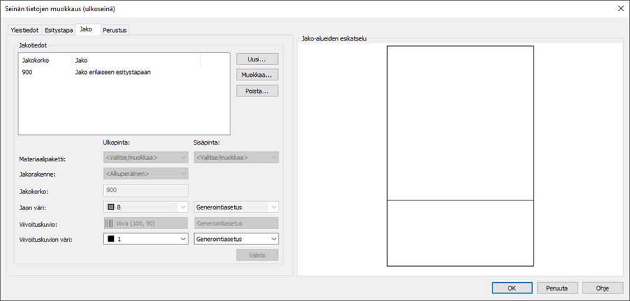 Tässä osiossa on mahdollista jakaa seinärakenne vaakasuunnassa erilaisiin rakennekerroksiin. Jakoa suorittaessa on syytä muistaa, että eri rakennekerrroksien nurkkien yhdistäminen joudutaan tekemään ohjelman logiikan mukaisesti, koska ainoastaan alin rakennekerros esitetään pohjakuvassa. Jakamista voi myös suorittaa pelkästään erilaisiin esitystapoihin samalla rakenteella.