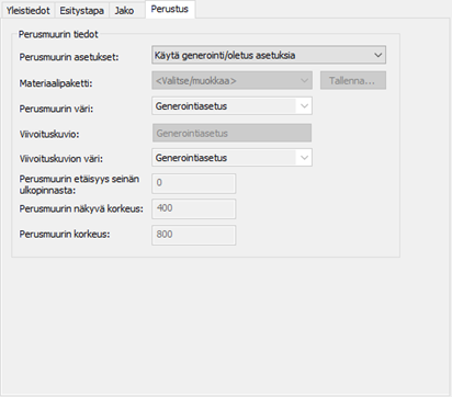 Perustus-välilehdellä asetetaan seinärakenteeseen piirrettävä perustus. Tietoja käytetään julkisivun ja 3D-mallin generoimisessa.