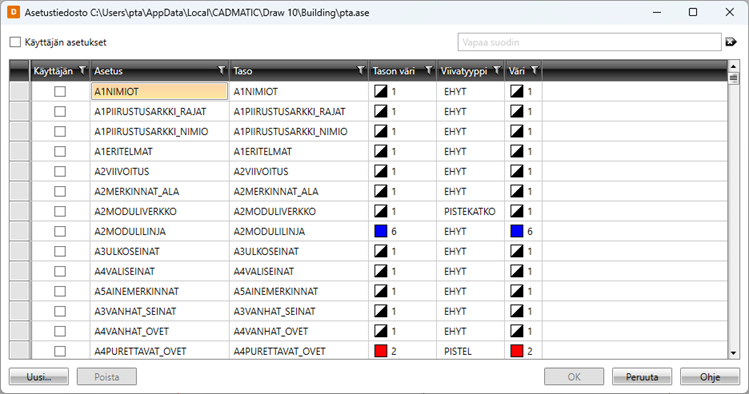 Jos taso halutaan tuoda käyttöön Käyttäjän asetus -toiminnolla, tulee nimen alusta löytyä $K$-etuliite.