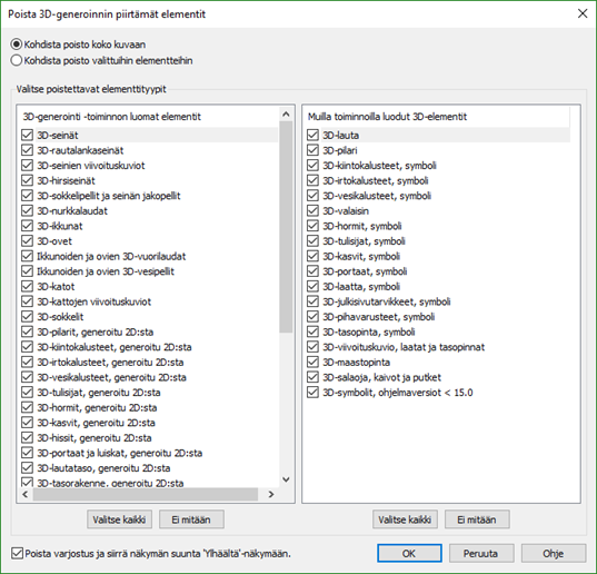 Valitse generoinnin 2D:stä 3D:ksi luodut elementit. Apuna voi käyttää myös listan alapuolelta löytyvää: Valitse kaikki ja Ei mitään -painikkeita.
