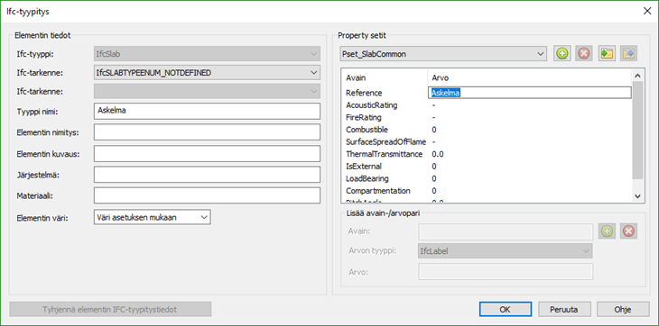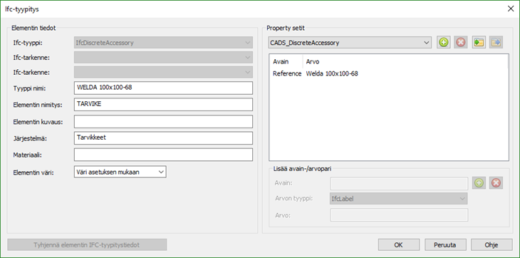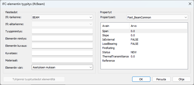 Syötä tyypitystiedot. Tiedot välittyvät IFC-malliin.