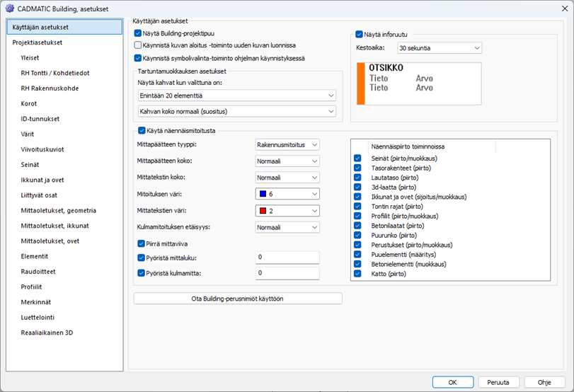 Täällä voit asettaa oletusarvoja eri toiminnoille sekä hallita esimerkiksi rakennuksen värimaailmaa.