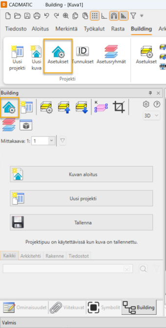|   | Building-sovellus > Building-välilehti > Projekti-ryhmä > Asetukset, TALOASETUS |