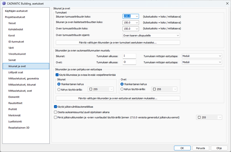 Ikkunoiden ja ovien automaattitunnusten muotoilu -kohdassa valitaan ikkunoille ja oville automaattisen tunnuksen muotoilu. Tunnuksille voidaan syöttää haluttu alkuosa ja valita esitetäänkö mitat modulimittoina vai millimetreinä. Oletusarvoina käytetään I, O ja Moduli -arvoja.
