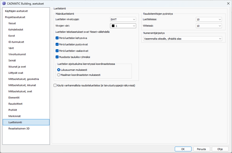 Määräluettelointi -kentässä valitaan luettelon viivatyyppi ja viivojen väri. Asetuksilla voidaan myös säädellä mitkä viivat taulukoissa näkyvät. Muutokset vaikuttavat kaikkiin uusiin taulukoihin, joita asetusten muuttamisen jälkeen tehdään. Kentässä voidaan valita myös mihin asentoon luettelo sijoitetaan jos käytössä on käännetty koordinaatisto.