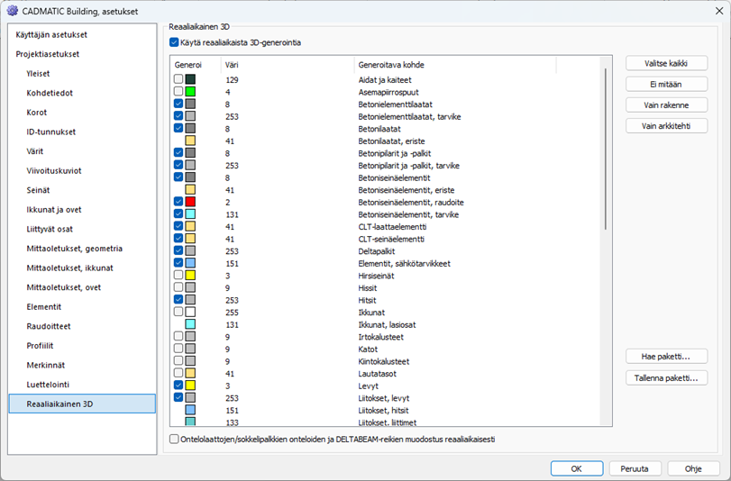 Valitse, mitkä osat halutaan luoda 3D:ksi. Voit valita kaikki, ei mitään, vain rakenneosat tai vain arkkitehtiosat. Suositeltavaa on käyttää vain niiden osien generointia, mitä kulloinkin tarvitaan.