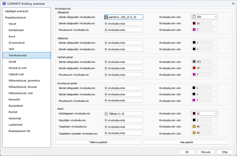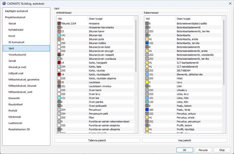 Näillä välilehdillä määritellään projektissa käytettävät värit ja viivoituskuviot. Nämä asetukset vaikuttavat julkisivu- ja 3D-generointiin. Värit on jaettu kahteen listaan, joissa erotellaan ns. arkkitehti- ja rakenneosat.