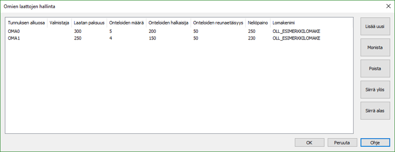 Huom! Jotta lomakkeella näkyy omien ontelolaattojen ontelot (vain pyöreät), tulee lomakenimenä olla OLL_ESIMERKKILOMAKE2. Lomakenimen voi vaihtaa myös aiemmin luotuihin laattoihin, jolloin lomakkeet tulevat oikein.