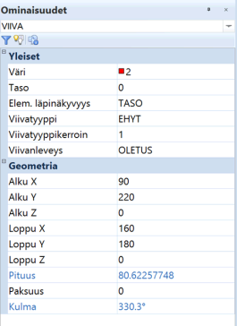 Kun valitset elementin, sen geometriset ominaisuudet näkyvät omissa kentissään. Ikkunan näyttämät kentät riippuvat valitsemastasi elementistä.
