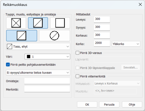 Muokkaa valitun elementin tiedot halutunlaisiksi Reikämuokkaus-dialogissa. Katso tarvittaessa lisätietoja kohdasta Piirrä reikiä, syvennyksiä ja ulkonemia.