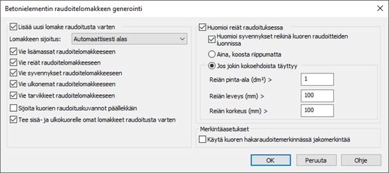 Toiminto huomioi elementissä olevat aukot sekä valituilla reunaehdoilla olevat reiät sekä luo elementin tietojen pohjalta kuorien raudoitekuvat omalle lomakkeelleen. Asetukset määritetään omassa dialogissa.