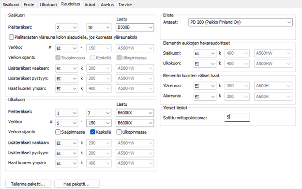 Valitse sisäkuorelle pieliterästen määrä, paksuus sekä laatu. Valitsemalla määräksi EI, ei pieliteräksiä lisätä kuoreen. Mikäli sisäkuoreen on määrätty kolous, voidaan kolo alittaa pieliteräksillä asetuksella Pieliterästen yläreuna kolon alapuolelle.