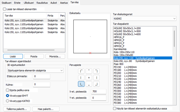 Tarvikeyhdistelmät voidaan tallentaa Tallenna paketti -toiminnolla. Tallennettuja paketteja voidaan tuoda elementtiin Hae paketti -toiminnolla.