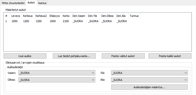 Painikkeella: Aukkodetaljien määritys... voidaan määrittää sekä hallinnoida aukkodetaljeja (erillisessä dialogissa).