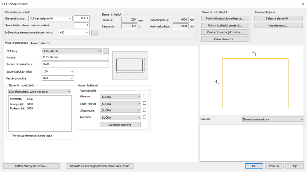 Tällä toiminnolla määritellään CLT-seinäelementti parametristen mitta- ja materiaalitietojen avulla. Samalla elementtiin määritellään mahdolliset aukot.