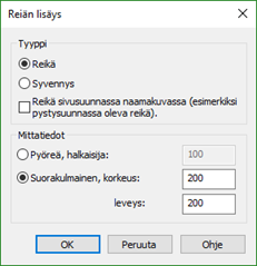 2. Valitse muoto ja valitse osoitetaanko reiän/syvennyksen/ulkoneman koko kuvassa vai syötetäänkö mitat. Syötä tarvittaessa mitat.