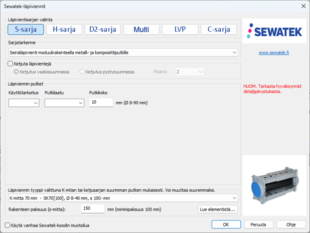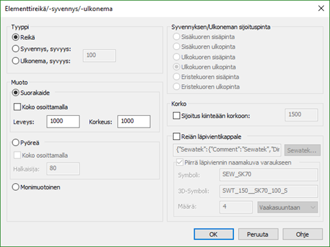 7. Valitse piirretäänkö läpivienti symboli naamakuvaan ja/tai 3D-malleihin. Sewatek-osia käytettäessä toiminto täydentää kentät automaattisesti.