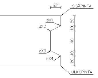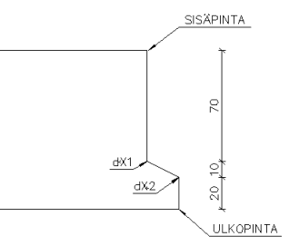 Ensimmäinen piste dX1 on 70 mm:n päässä sisäpinnasta, ja edelleen 20 mm:n päässä ulkoreunalta, joten dX1=20 (20 mm siirtymä x-suunnassa) ja dY1=70 (20 mm:ä edellisestä pisteestä).