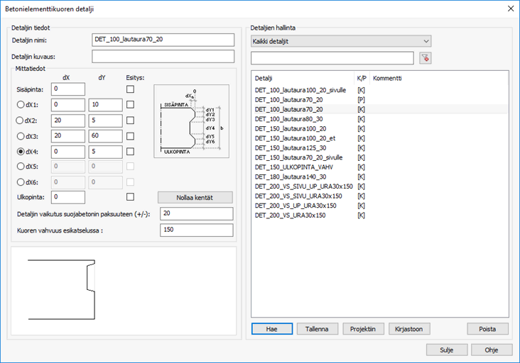 Tällä toiminnolla määritellään sekä hallinnoidaan elementtien reunadetaljeja. Samassa toiminnossa määritellään detaljit sekä betoni-, että CLT-elementeille.