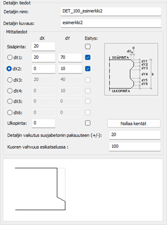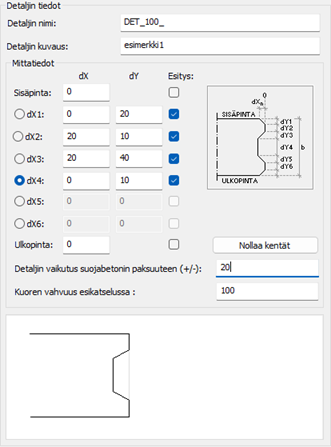 Sisäpinta sijaitsee 20 mm:ä ulkopinnan sisäpuolella, joten laitetaan kohtaan: Sisäpinta: arvo dX=20 (=20 mm sisäänpäin).
