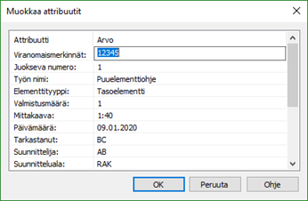 Tällä toiminnolla muokata elementtilomakkeen nimiön tietoja. Toiminto avaa dialogin, jossa muokkaus tehdään.