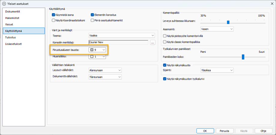Vaihdetaan piirustusalueen taustaväri vaaleaksi (Tiedosto > Asetukset > Käyttölittymä > Piirustusalueen tausta).