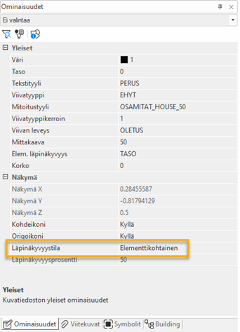 Jos ikkunat halutaan läpinäkyviksi, tulee Ominaisuudet-ikkunasta valita läpinäkyvyydelle arvoksi Elementtikohtainen.