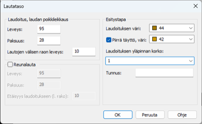 Syötä pohjakuvaan piirrettävän lautatason tiedot kuvan mukaisesti. Kuittaa OK tietojen syöttämisen jälkeen.