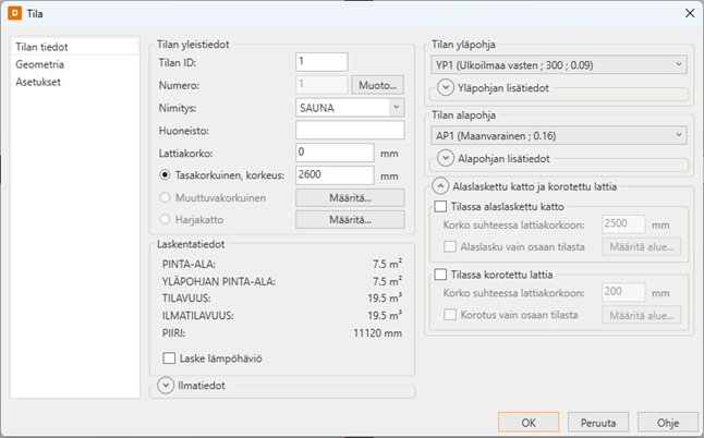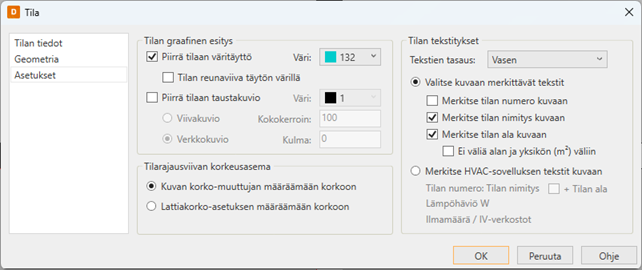 Osoita tilan vastakkainen nurkkapiste (piste 2). Ruudulle aukeaa tilan määrittely -dialogi.