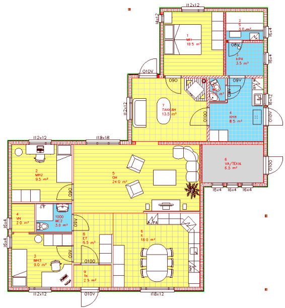 Huonetiedot määritellään pohjakuvaan tilatoimintojen avulla. Tilatoiminnot mahdollistavat pelkkien huonetietojen lisäksi mahdollisuuden viedä tilojen tiedot energialaskentaan johtumistiedoiksi. Tässä harjoituksessa tilamäärityksiä käytetään yksinkertaisesti ainoastaan huonetietomerkintöjen luomiseen pohjakuvaan.